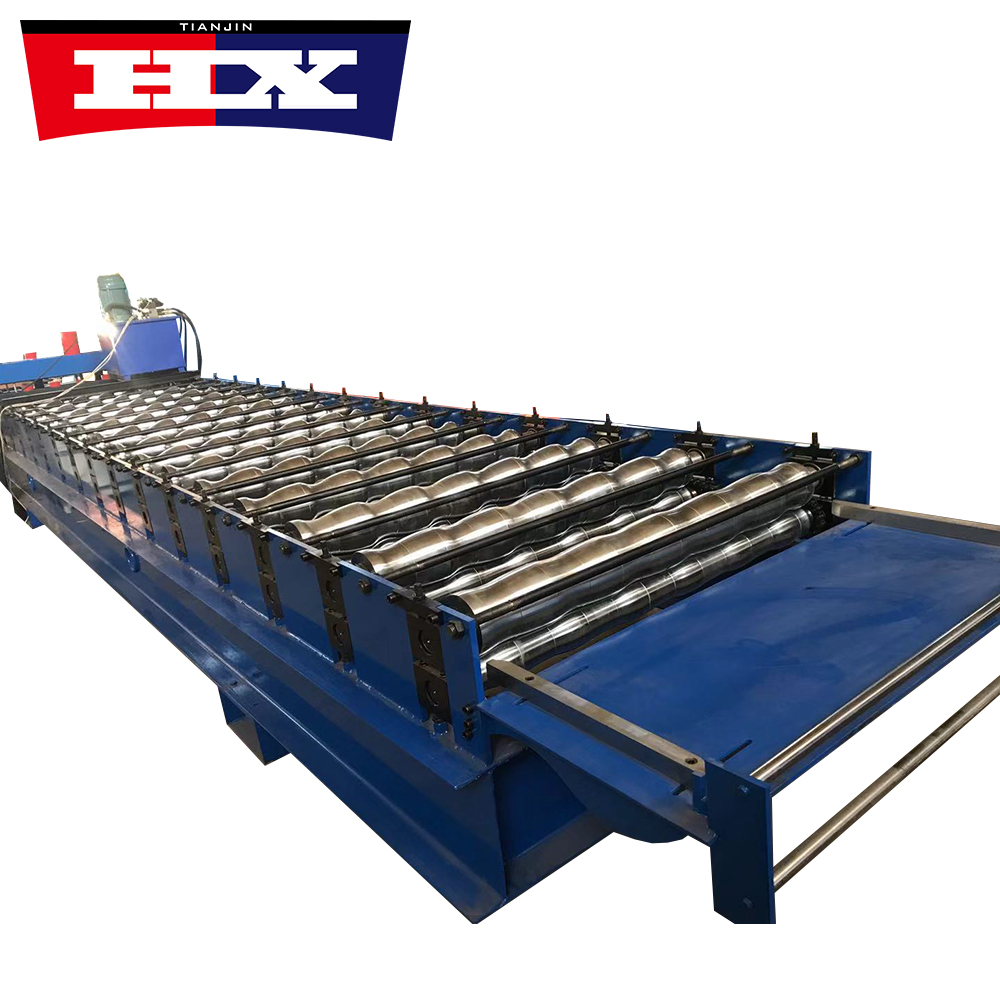 The metal glazed roofing roll forming machines is mainly composed of the discharging machine, the feeding introduction platform, the forming main machine, the die pressing device, the forming shearing device, the hydraulic station, the computer control system, and the finished product bracket.